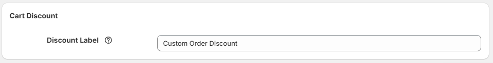 - Add a Discount Label for cart-level offers (e.g., “Custom Order Discount”).