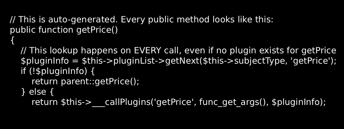 Plugins are not free. Every interceptor is a PHP method call you didn’t write but you will absolutely debug.